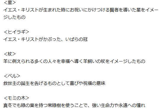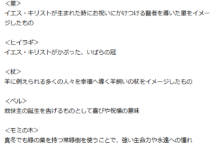 また、ツリーの飾りにも意味があって、星は希望や道しるべ、ベルはうれしい知らせ、ツリーを彩る光は感謝の気持ちや、幸せを願う意味が込められているといわれています。