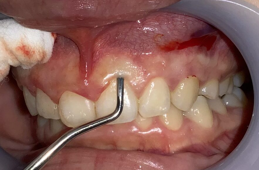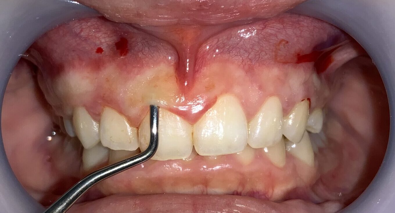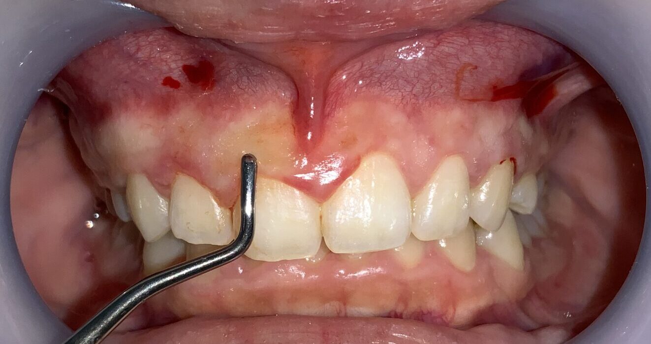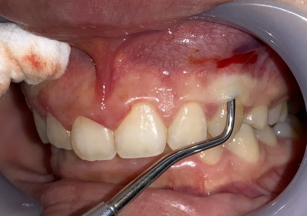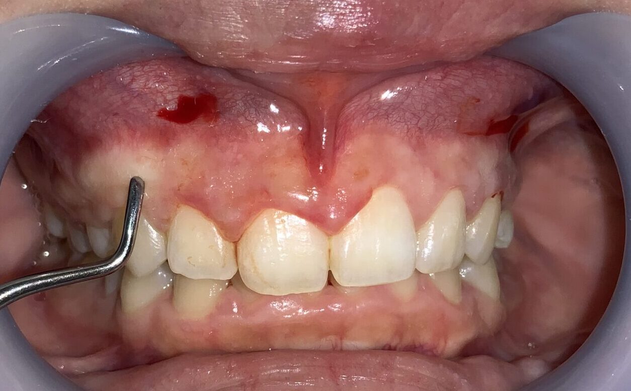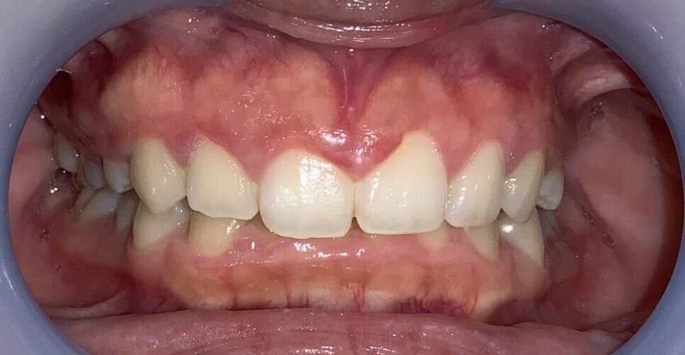 歯ぐきが被っており、歯が小さく、左右差があります。歯ぐきが被っている影響で歯ブラシの清掃が届かないので、プラークの堆積や歯ぐきの発赤も認められます。
