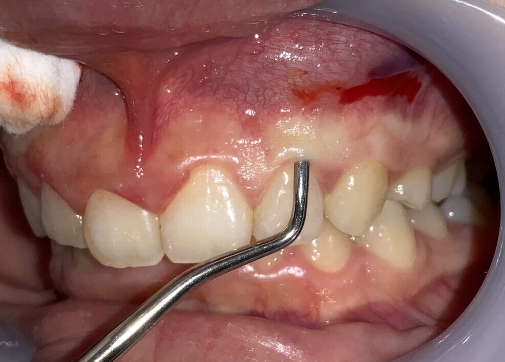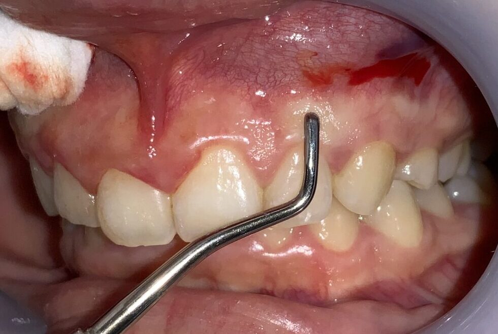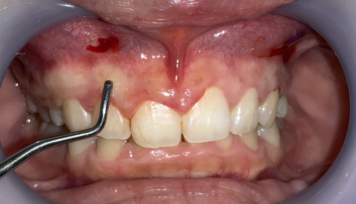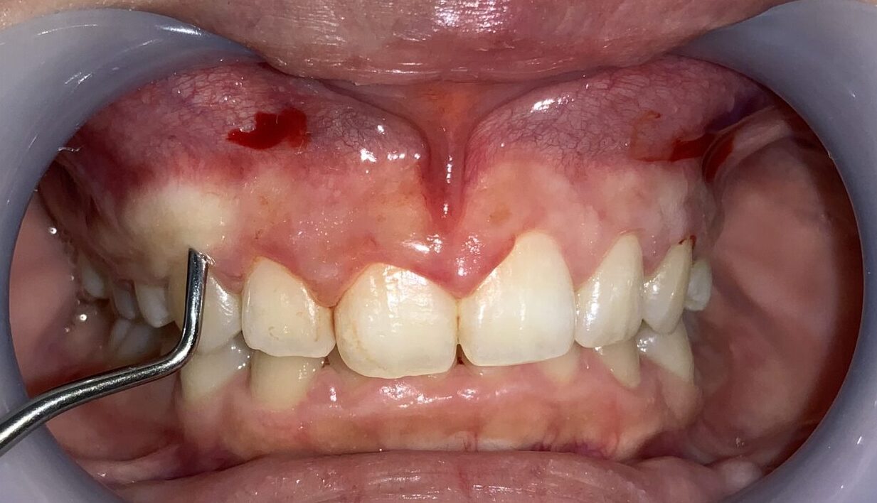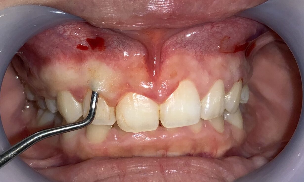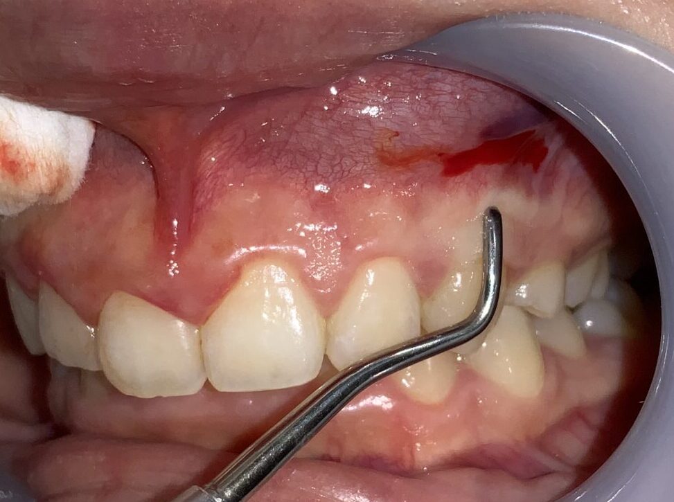 歯ぐきが被っており、歯が小さく、左右差があります。歯ぐきが被っている影響で歯ブラシの清掃が届かないので、プラークの堆積や歯ぐきの発赤も認められます。