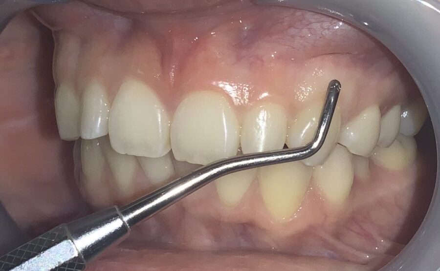 専用の器具を使用して、歯と歯ぐきの関係、歯ぐきの厚みやポケットの深さを丁寧に審査します。必要な歯ぐきと不要な歯ぐきの見極めがポイントです。検査用の専用器具を歯と歯ぐきの間に入れて、歯ぐきの厚みや深さの検査を行います。