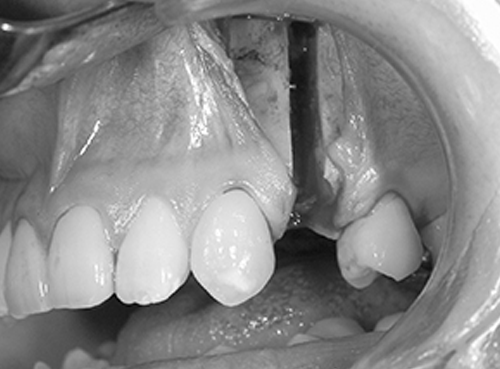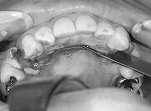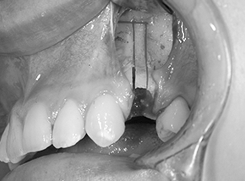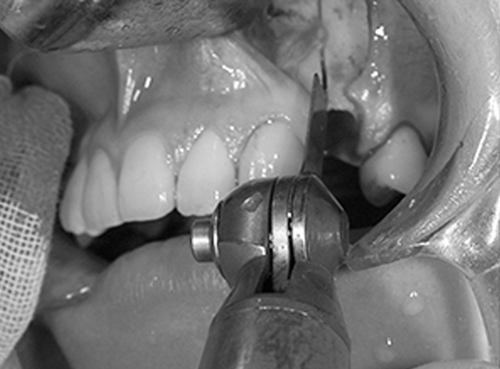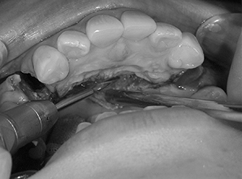 剥離(口の中で骨が見える範囲)は、上は隣の歯の根っこまで、内側は小鼻の付近まで、お鼻の粘膜もお口の中から一部をはがしておくと、骨がきれいに切れて、手術後の出血が少なく、腫れも少なく、治りが早くなります。