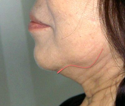 さらにバッカルファットが垂れ下がると、フェイスラインが不明瞭になり、口角の下の顎のラインがたるんできます。