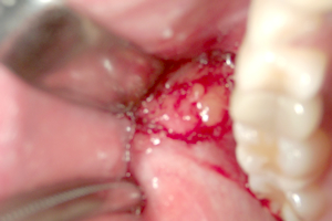 除去した脂肪部分を消毒した後、死腔がないように吸収糸を用いて剥離層に従って、各層縫合をおこないます。切開した粘膜も吸収糸にて縫合し終了です。