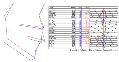 レントゲンやCT、頭部エックス線規格写真、顔面写真、かみ合わせ模型を用いて、診断用分析表を作成します。上顎が出ている、下顎が小さい、前歯が傾斜している等の症状を分析します。