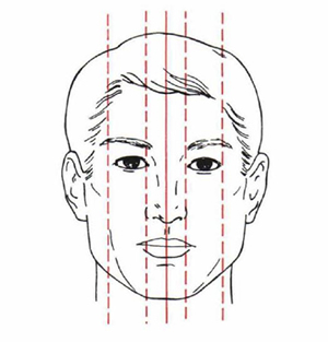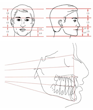 顔のプロポーションを分析する最初のステップとして,正面観で目/鼻/口の幅の相対的比率と左右の対称性を検査します。正常人では顔はわずかに非対称です。このことは右側,または左側のみを合成して作った顔面写真を真の写真と比較してみると、よくわかります。