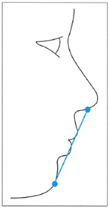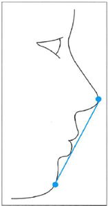鼻尖とオトガイ部最突出点を結ぶ線に対する上下の唇の最突出点の距離で、上下口唇の突出や後退を診査します。日本人正常咳合者の平均値は上唇で-1.4~1.0mm、下唇で-0.4~-0.6mmとされています。