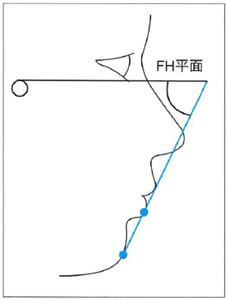 下唇の最突出点とオトガイ部最突出点を結ぶ線とフランクフルト平面のなす角度で診査します。日本人正常咬合者の平均値は69.1。±1.62とされています。