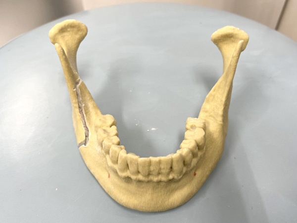 CBCTやパノラマレントゲンをもとに、移動する下顎の予定位置や骨切りラインの神経、血管の走行に留意してデザインをおこなう。