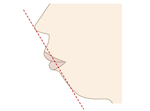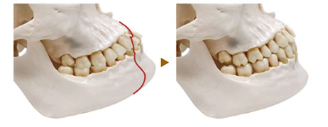 このような場合は上下のアゴを後退させて、オトガイと呼ばれるアゴ先を前に出してエステティックラインを整えます。口の中からの手術で完璧なフェイスラインを形成します。