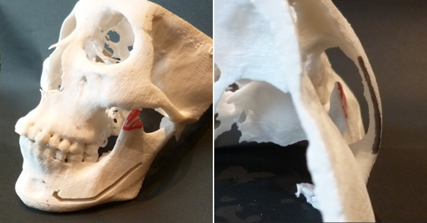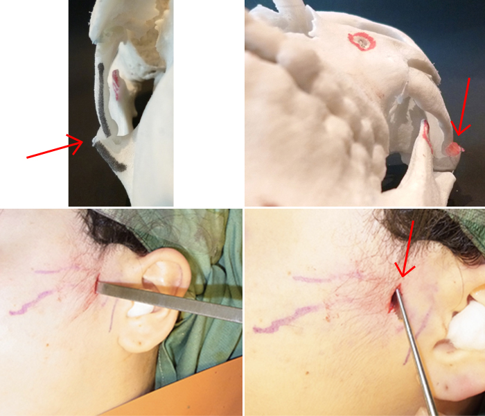 光学模型による筋突起(赤い部分)と頬骨弓(黒い線)の位置確認をしているところです。 頬骨を小さくするために頬骨弓を内側に入れて、筋突起にあたってしまうと、筋突起についている側頭筋の邪魔をしてしまいお口があかなくなってしまいます。 |