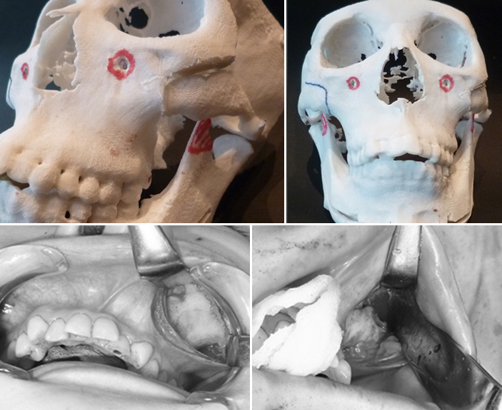 【上部掲載-左の模型写真】 【上部掲載-右の模型写真】 【下部掲載-左の術中写真】 【下部掲載-右の術中写真】 |