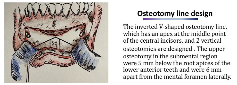 本術式は下顎骨の矮小化のため、下顎骨の下方延長を試み、軟組織のテンティング作用を利用し、正貌、側貌における下顔面の下方延長に適応しています。また、縦方向の中抜きをおこなう場合には、オトガイ幅径を減少させ、一般的に小さい顎と呼ばれるような形態改善に適応しています。垂直骨切りは水平骨切りをおこなったのち、正中部の骨切除をおこなうため水平骨切りの中抜き法を、縦方向として、垂直方向におこなう術式であり、オトガイの形態と幅径を改善する術式です。20mm程度の幅寄せが可能ですが、骨切り後の段差の問題や、可動骨片が小さくなるため、移動骨片の血液供給不足が生じやすく、手術中の粘膜骨膜弁の形成、移動骨片に対する栄養血管の確保と管理や手術後の骨片の固定など、手術後管理に注意が必要です。