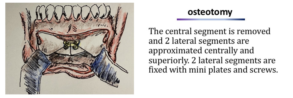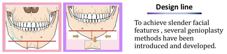 オトガイ領域の垂直骨切りと水平骨切りをおこない、中間の一部の骨片を切除し、オトガイ形態を改善するために適応します。顎の短縮手術である中抜き法を、縦方向に骨切りして中抜きする方法です。この方法により顎先を狭めて小さい顎を創ることができます。単独あるいは水平骨切り術と同時に行なうことが可能です。