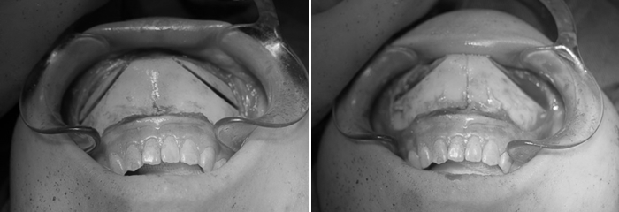 骨片の固定は骨切離後におこなわず、骨にひびを入れた状態で骨切離を止め、仮止め用のチタンプレーティングをおこないます。バラバラになってしまった骨片は復位が困難なだけでなく、手術操作による粘膜骨膜弁の温存が妨げられる恐れがあります。粘膜骨膜弁が損傷すると、血液供給の妨げになり、骨炎、骨膜炎、骨髄炎を惹起し、骨壊死(Bone Necrosis)に至る場合もあります。そのための手術中の仮止め固定を実施しています。経皮的な観察を終えたら、左右の骨片を中央に寄せて、PLLAプレート、チタンミニプレート、マイクロセカンドプレートなどで固定します。両端の段差が生じた場合はピエゾ、ボーンソー、チゼル、骨ノミでトリミングをおこないます。