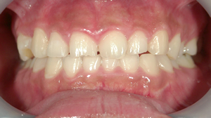 前歯の部分の歯ぐきが歯に覆いかぶさり、萌出不全状態です。