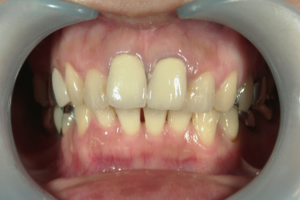 前歯2本の歯の色の不自然さとバランスを整えた患者さんです。前歯4本のハリウッドスマイル治療で自然なバランスに整えました。歯の艶や透明感も美しく治療しています。治療回数は2回でした。