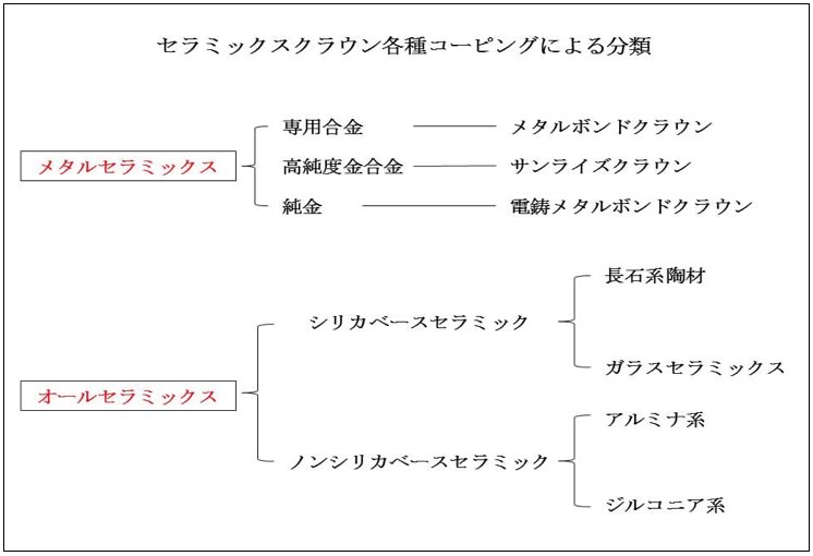 代表的なものに金属を使用し、その上に陶材を盛るメタルセラミックスクラウン、そして金属を使用せずコーピング材料までセラミックスを使用したオールセラミックスクラウンがあります。それぞれに特徴があり、診査と診断の後最良の材料が選択されます。適応される部位(前歯か奥歯か)、単独の歯か連結されるブリッジか、どれだけの審美性を求めるのか、土台となっている歯の色の問題、これらの鑑別診断を誤るといくら優れた材料を使用したとしても、失敗におわります。