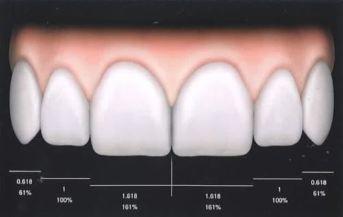 審美は調和により大きく左右されます。正しい調和がとれているなら美しいと思われるし、均整がとれていないと美しいとは思われません。 調和の概念は自然界にも多くみられ、木の葉や花びら、松かさにいたるまで、均整のとれたバランスがあります。このバランスを示す比率は、約1.618:1となり、「ゴールデンプロポーション」といわれています。 歯科においては天然歯を正面から見た際に前歯と犬歯の幅にも当てはまるといわれています。