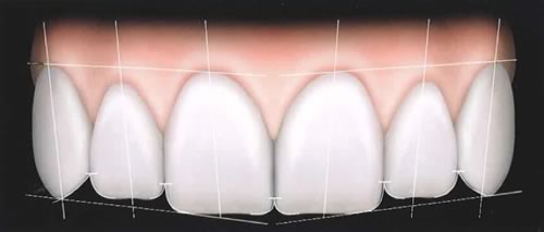 次に歯の角度と歯茎との位置です。 歯の正中に対する前歯の角度をみたとき、やや内側に傾いています。そしてそれは前歯から犬歯にむかうにつれ、大きくなっていきます。理想的には反対側の歯と左右対称に、ミラーイメージのようになることが望ましいと言われています。 そして歯の位置と歯茎のライン。理想的な天然歯では、中切歯と犬歯を結んだ線より1mm内側に側切歯がくるのが良いとされています。 このように審美には基準とルールがあります。あくまでも基準ではありますが、この健康的で美しいとされるバランスを考慮したうえで、診査・診断の後、一人一人にあった最適な治療と施術を行い、最大限の美しさを引き出さなければなりません。