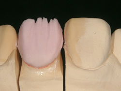 近年では90年代に2ケイ酸リチウム製のものが開発され、2005年以降はさらに材料開発が進み、高温加圧成型することで強度を増したものが広く使用されています。その製作方法は、従来の鋳造法における製作過程によく似ています。鋳型を作製し、約800℃でセラミックを溶かして圧力をかけて流しこみます。金属のクラウンを製作するさいの手作業と違って、機械が全自動で行うため、テクニカルエラーが起きにくく、安定した適合の良い製品ができます