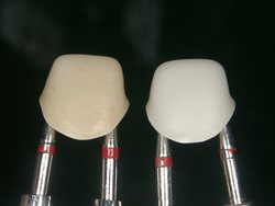 補綴修復においてジルコニアは、最終的に高密度焼結体の状態でクラウンのコーピングとして使用されます。製作の過程の中で、低密度の状態でCAD/CAMを用いて切削して高密度に焼結するのか、高密度焼結体の状態で切削するのかのどちらかです。いずれにしろCAD/CAMを用いてブロックを削り出し、製作していきます。