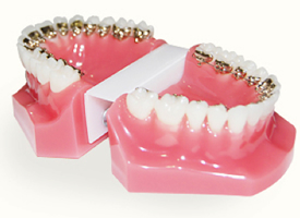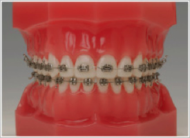 昔から、矯正歯科治療の定番として、最も浸透している金属製の矯正装置です。多くの矯正治療に使用されるために、費用が安く、オプション装置が充実している点がメリットです。欠点としては、見た目がいかにも矯正歯科治療中ですと言わんばかりのあまりよくないという短所があります。しかしながら、欧米では矯正歯科治療自体がステイタス治療として位置づけられているため、多くの患者様がメタルブラケットを選択されます。
