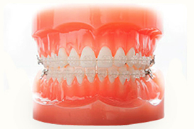 出来るだけ装置自体は目立たない方が良いと、治療期間中の見た目を重視される成人の患者様にご選択いただくことが多い矯正装置です。セラミックや樹脂製の装置で、歯の色に近いため、目立ちにくいという長所があります。メタルブラケットよりも高価ですが、金属製装置に比べて目立たないために、人気の装置です。