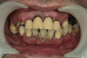 重度の歯周病と虫歯が混在した様態です。歯周病治療は歯石の除去と歯と歯ぐきのトリートメントをおこない、歯ぐきの再生を促す細胞活性化成長因子薬を塗って、歯ぐきの治りを早めました。歯と歯ぐきの境目の赤い炎症は残っていますが、患者様の希望によりセラミックの歯を被せた後に歯ぐきの赤みの残っている部分のみを治療しました。通院回数は3回です。