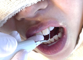 ホワイトニング剤を歯の表面に塗布します。カンファークリニック独自の調合のホワイトニング剤を使用します。ホワイトニング剤を塗り、時間をおいて薬剤を浸透させた後除去するという工程を3回繰り返し、しっかりと薬剤を浸透させます。 |